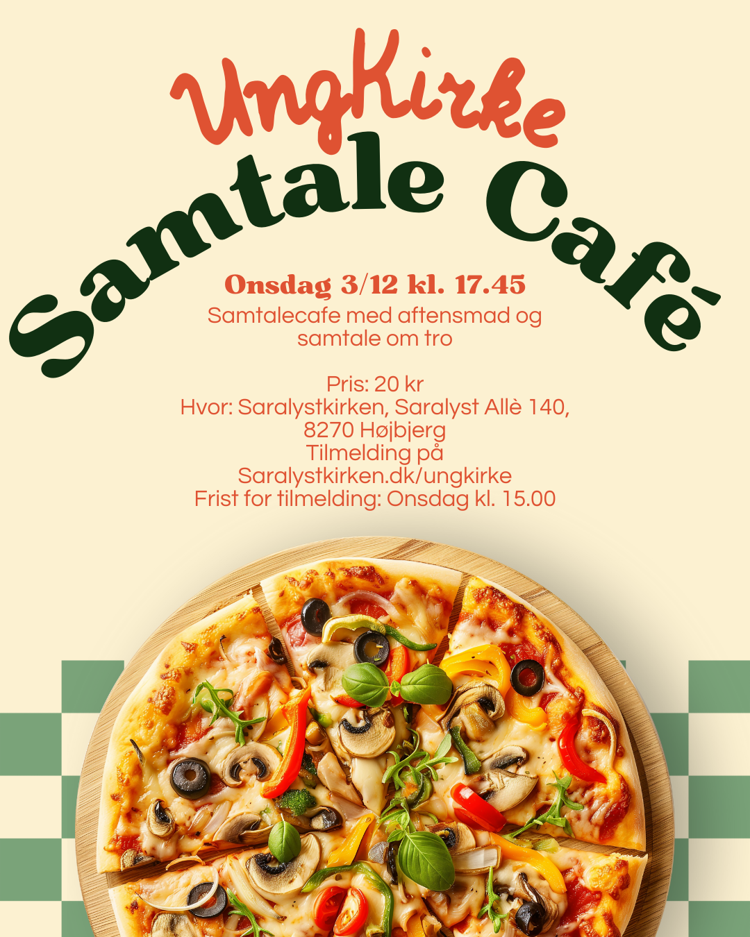 Vi starter kl. 17.45 i Saralystkirken med en lille leg for at bryde isen, efterfuldt af pizza og samtaler ud fra små samtalekort om tro. Vi er færdige kl. 19.00, men man er velkommen til at blive hængende og bare hygge og spille spil. Eller måske endda tale videre om tro.